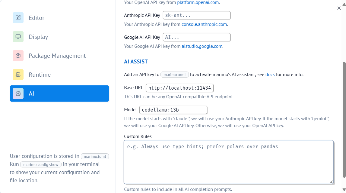 marimo also supports integrating with custom LLM providers for code completion suggestions. This allows you to use your own LLM service to provide in-line code suggestions based on internal providers or local models (e.g. Ollama). You may also use OpenAI, Anthropic, Google, or any other providers by providing your own API keys and configuration.
